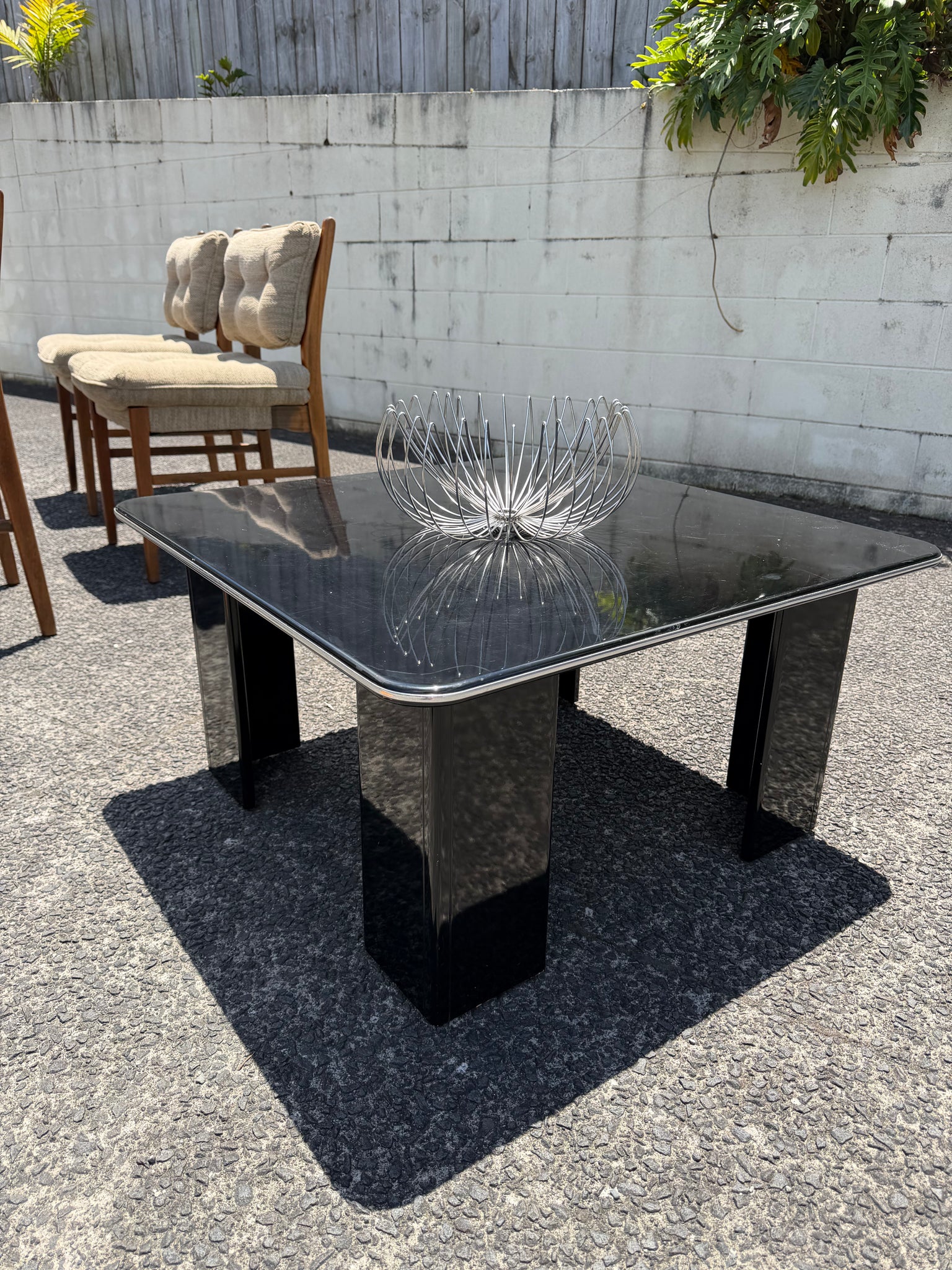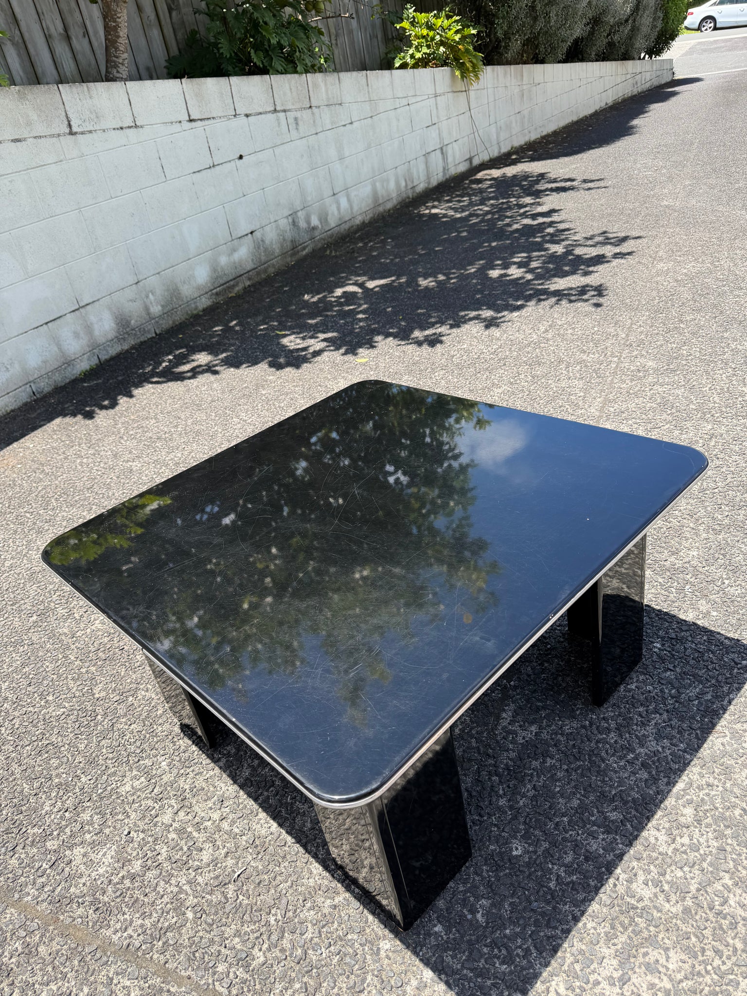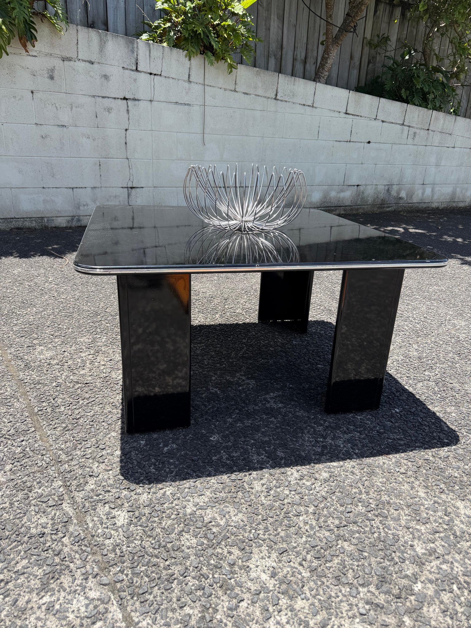 Black lacquered coffee table serving art deco vibes with the gold trim