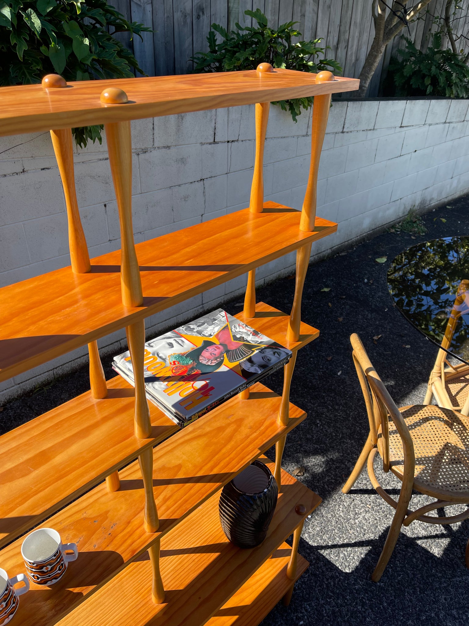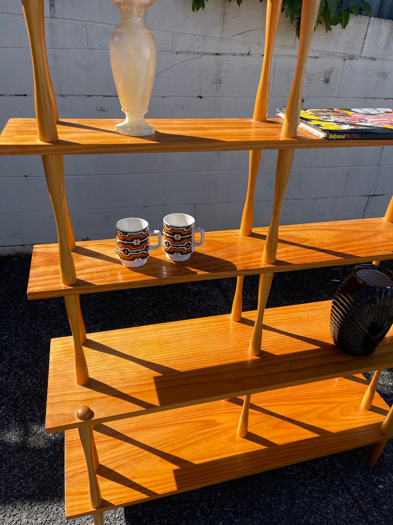 These are just so cool! The modular spindle shelves are am iconic mid century style. The shelves come apart so we can have them as tall or short as you want. The pillars screw apart.